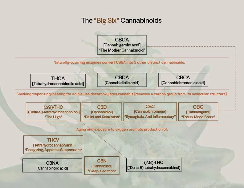 With a basic overview of the endocannabinoid system and its primary receptors, let’s get into “The Big 6” cannabinoids and how they interact with the ECS and each other to get you high and provide relief. Below is a cannabinoid tree that traces the origin of each of the “Big 6” (in brown) within the plant’s chemistry: