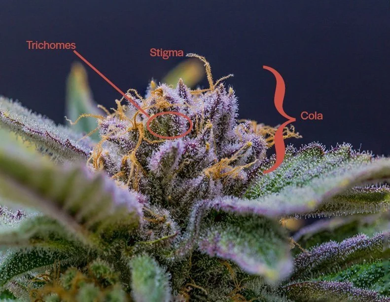 The colorful orange hairs decorating the bud, called stigmas, are a crucial part of the female plant’s reproductive system (the pistil) and help collect and retain pollen from male plants. For today’s entry, I want to focus the biology portion on trichomes. If you’ve ever wondered why certain types of flower appear to be covered in a crystalline sugar like patchwork, you’ve discovered trichomes. These resinous glands, which can be found scattered across both flowering portions and leaves of the plant, contain the active compounds in cannabis that come together in the entourage effect to get you high - cannabinoids, terpenes, and flavonoids (which are also found in leaves and seedlings). As a general rule, you can expect trichome coverage to correlate with flower quality and cannabinoid presence. Said simply, the frostier the nug, the stronger and more rich you can expect your cannabis experience to be.